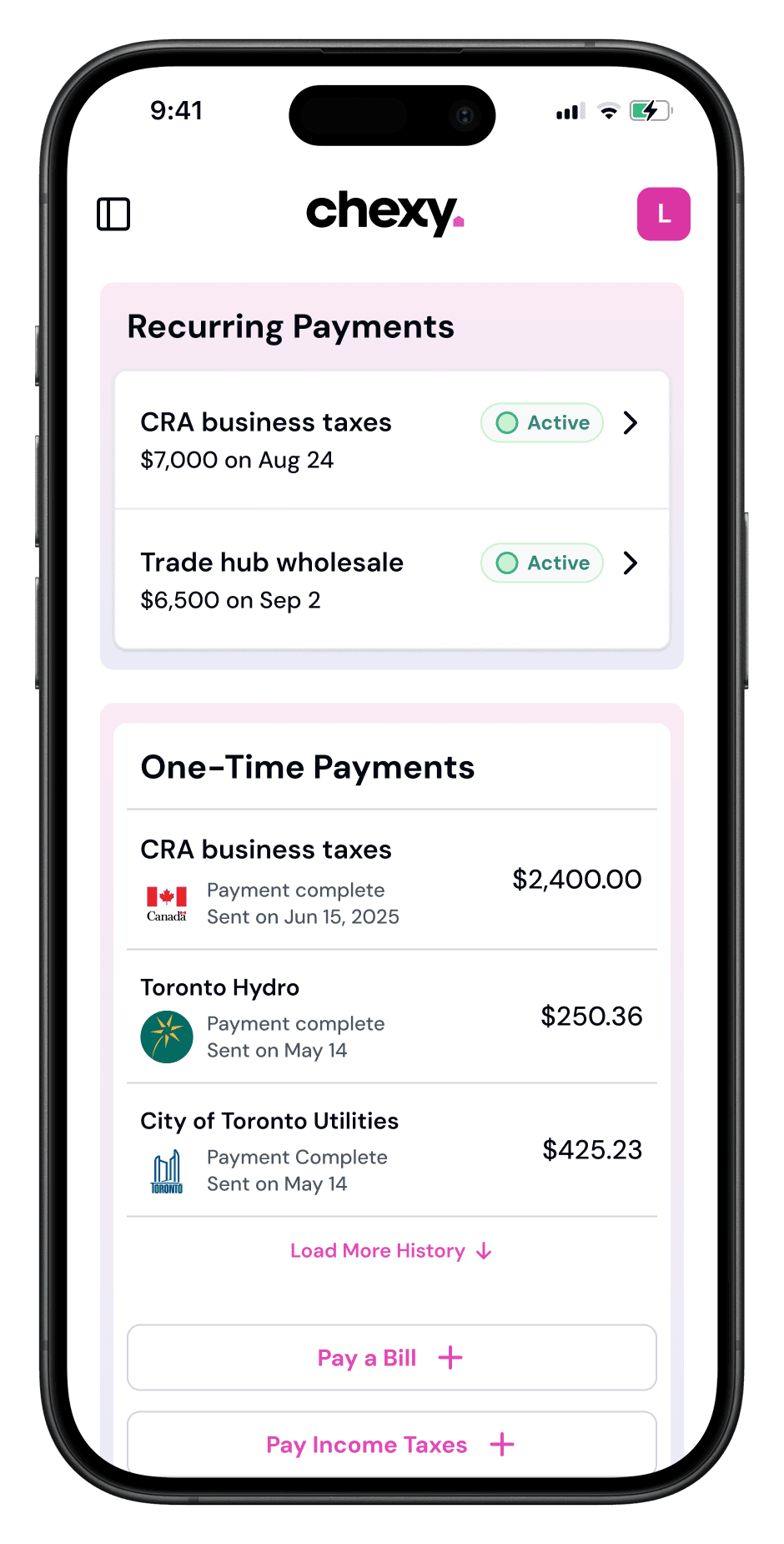 You’ll receive unique Chexy PAD account details when you complete setup. As a reminder, please set up your payment in Chexy first, as the funds must be made available in your Chexy account before the CRA withdraws.