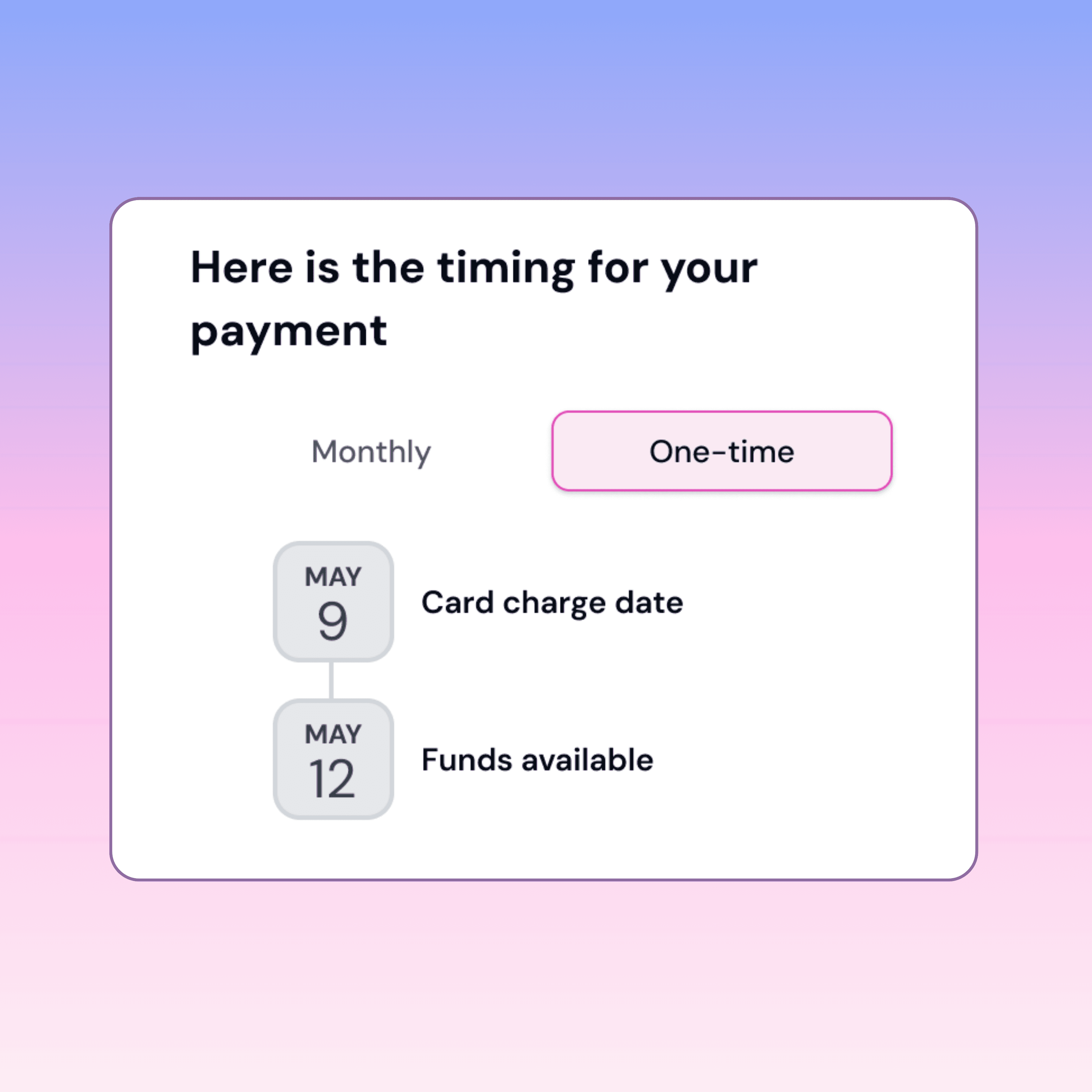 Choose whether this will be a one-time payment or a monthly recurring payment, and review the card charge date and the funds available date before confirming.