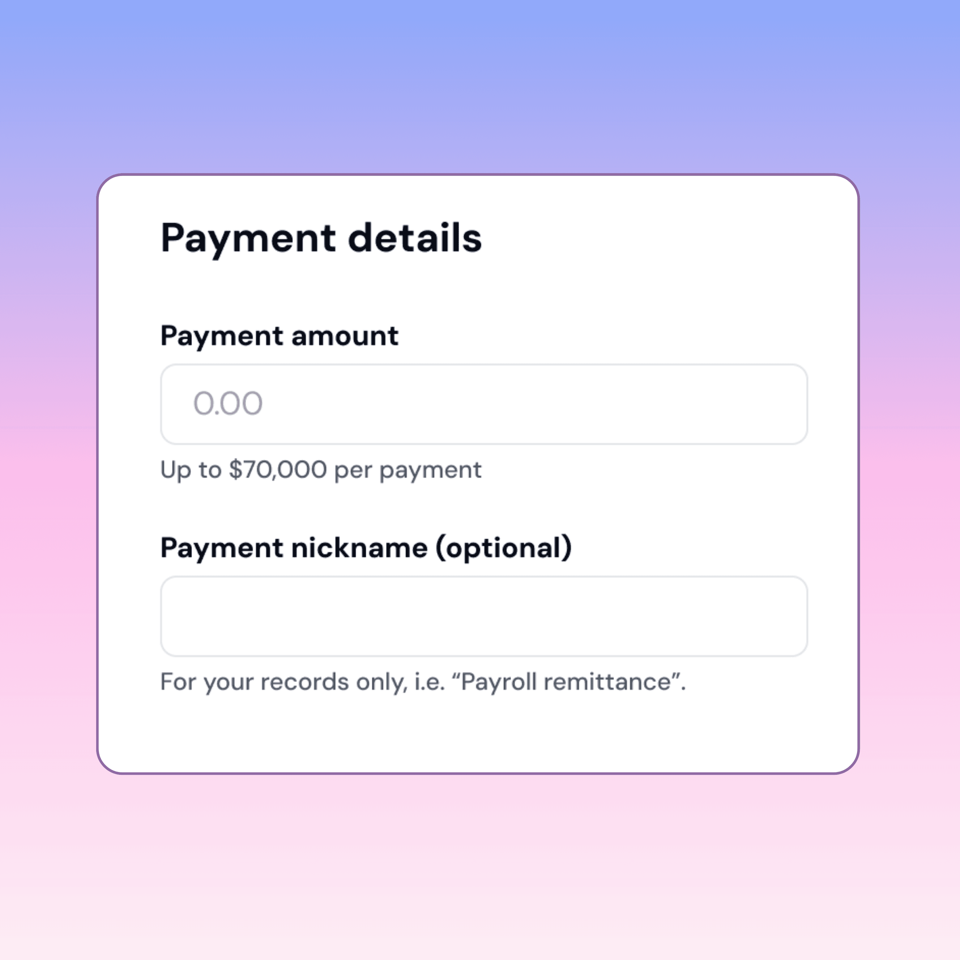 Enter the exact payment amount, up to $70,000 per payment, and optionally add a payment nickname to help identify it later.