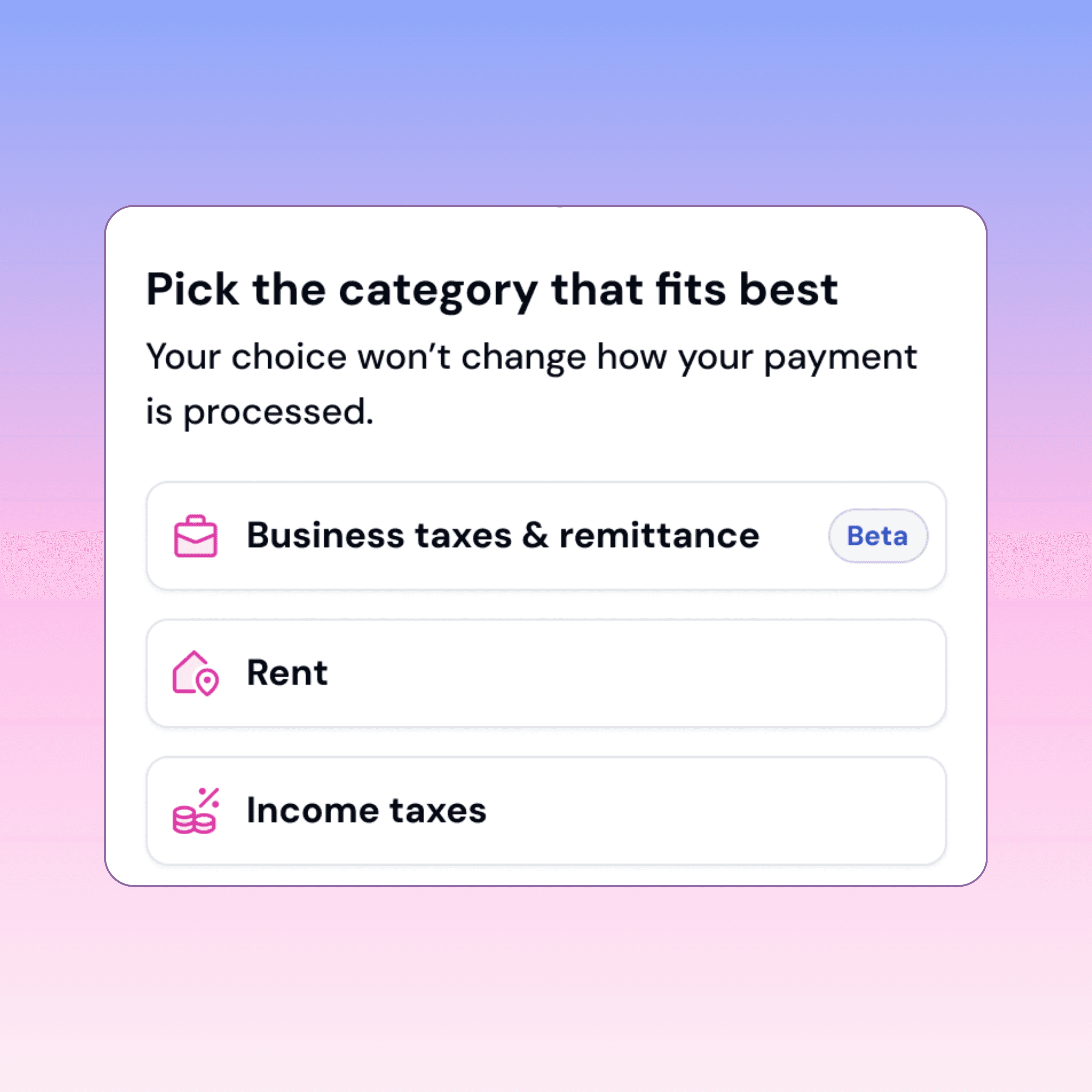 After signing up, click "New Payment +" on your dashboard and then click on the business expenses tab.