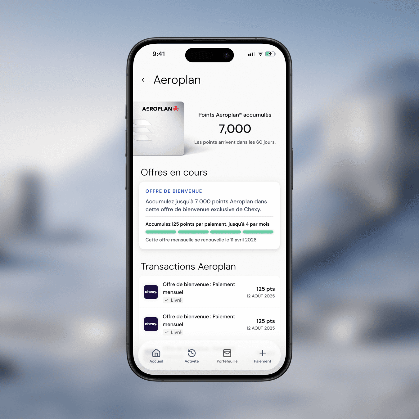 Les points Aéroplan sont obtenus lorsque les paiements admissibles sont complétés par l’entremise de la plateforme Chexy.