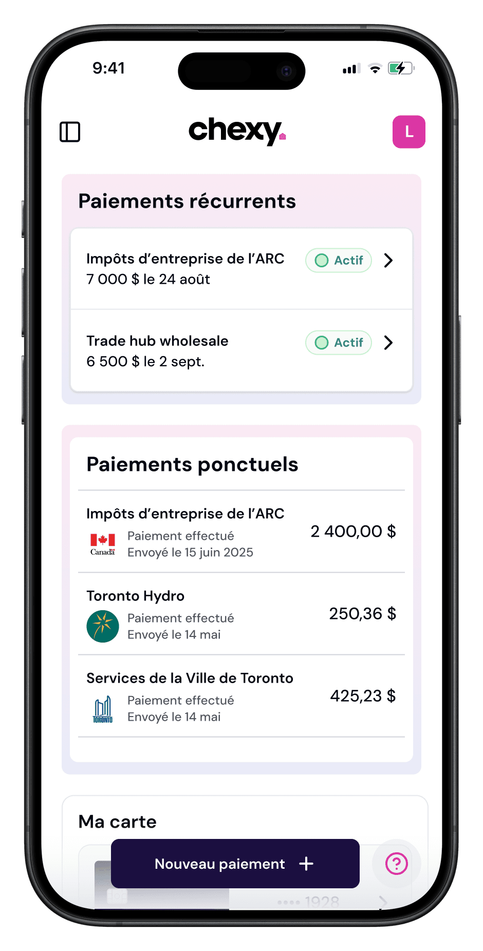 ● Utiliser la plateforme Chexy pour effectuer des paiements admissibles conformément aux conditions d’utilisation de Chexy, y compris les catégories de paiement admissibles telles que définies par Chexy;