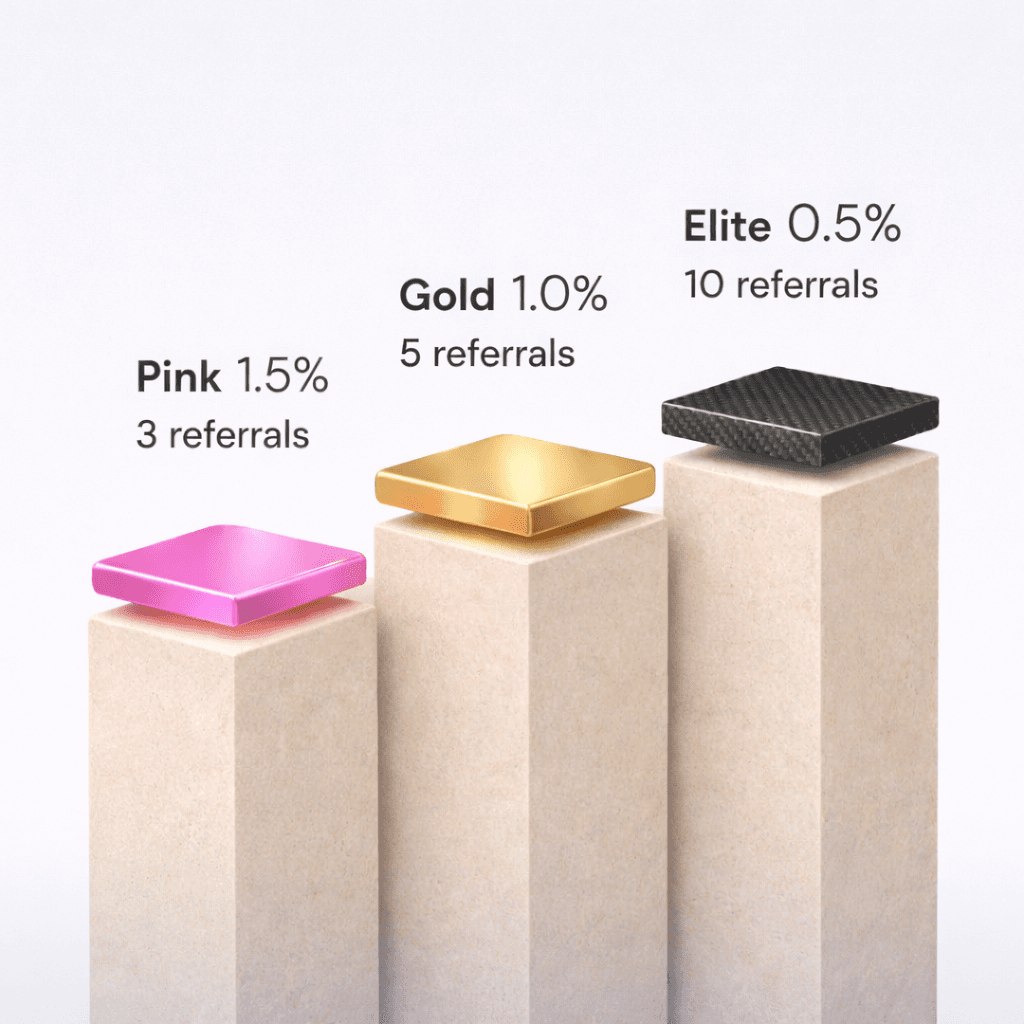 Refer 3 friends to achieve the Pink tier and earn a 14% reduced fee.
